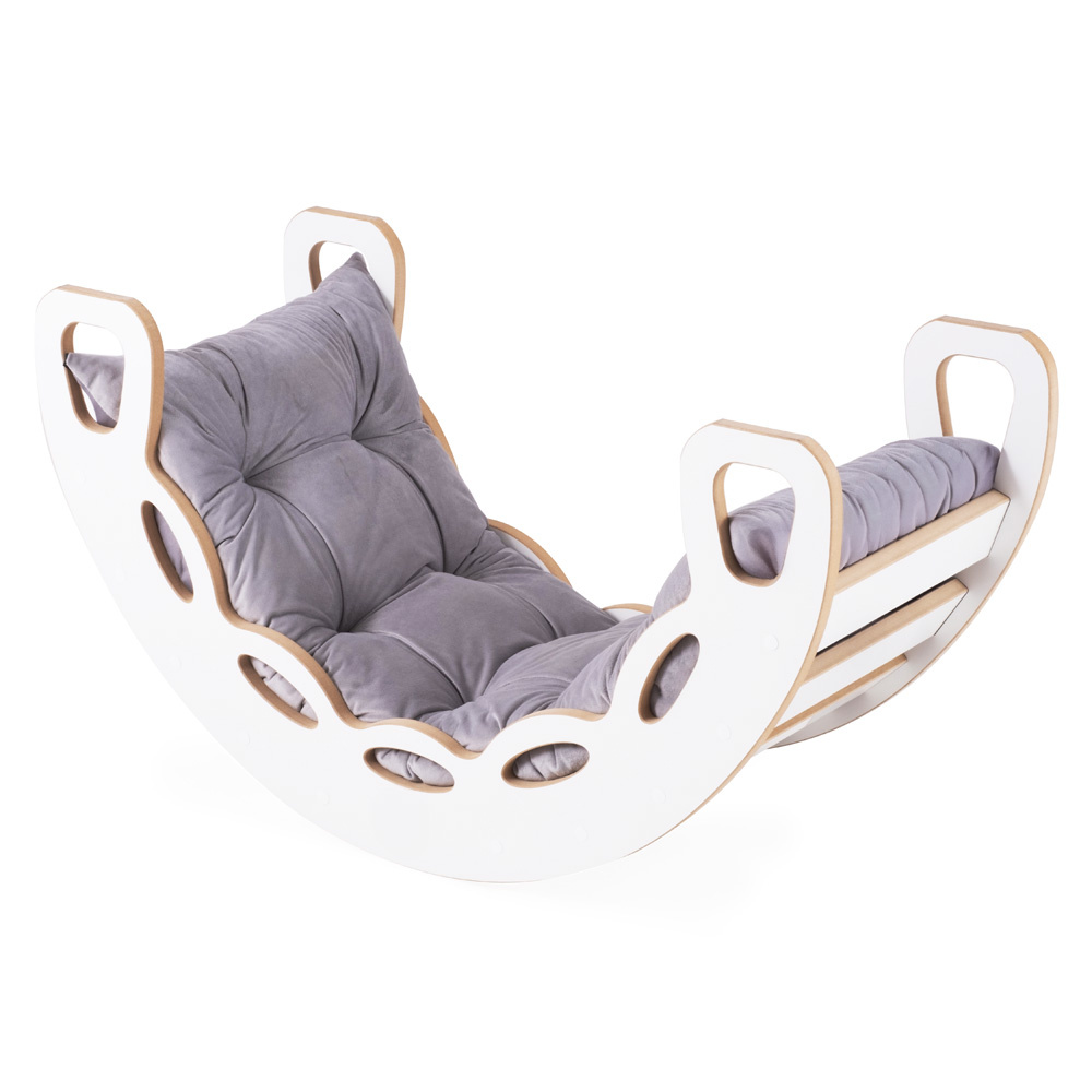 PLUSH NEST Small Rocker 4-in-1 Wippe + Kletterwand/Rutsche + Kissen (Velvet grey), weiß Wooden Play